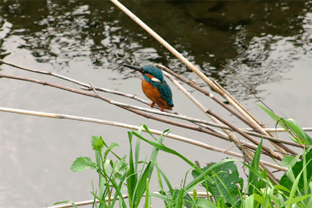 カワセミは、漢字で「翡翠」と書くそうです。(宝石の「翡翠(ヒスイ)」と同じですね。)その漢字の通りの鮮やかな色をしています。 |