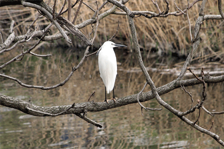 この日は、真っ白なコサギが水辺の木の枝に羽を休めているのを見つけました。
